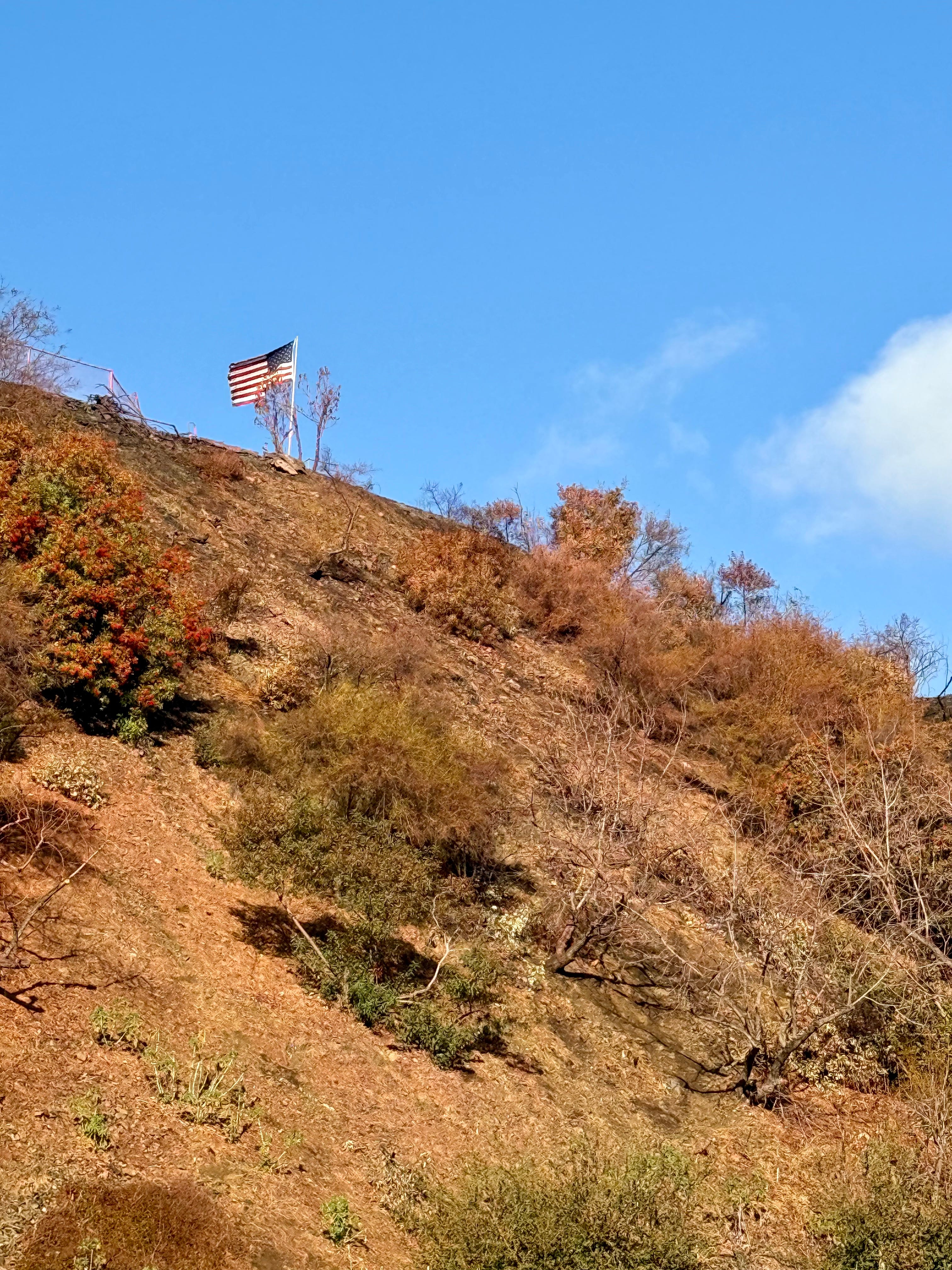 I returned to Los Angeles on Tuesday after two weeks on the road. Upon arrival I inspected the backyard and discovered the burn line came about 20 feet from our wooden deck. The dry boards would have been the perfect kindling to set the property ablaze. Our home backs up to Westridge-Canyonback Park where the fire raged uncontrollable for days. The park is also known as the Big Wild, a 20,000-acre urban wilderness normally full of wildlife and adventure but this early evening it was dead silent. When my eyes caught my neighbors American Flag lit up and waving on the hill it felt like a testament to the bravery of the pilots and firemen who saved our canyon. In the middle of the night I was woken by our local owl. I jumped out of bed and went to the window to see them but the new moon left the landscape dark. Still I was thrilled to hear the who-who’s as they too checked in on one another.